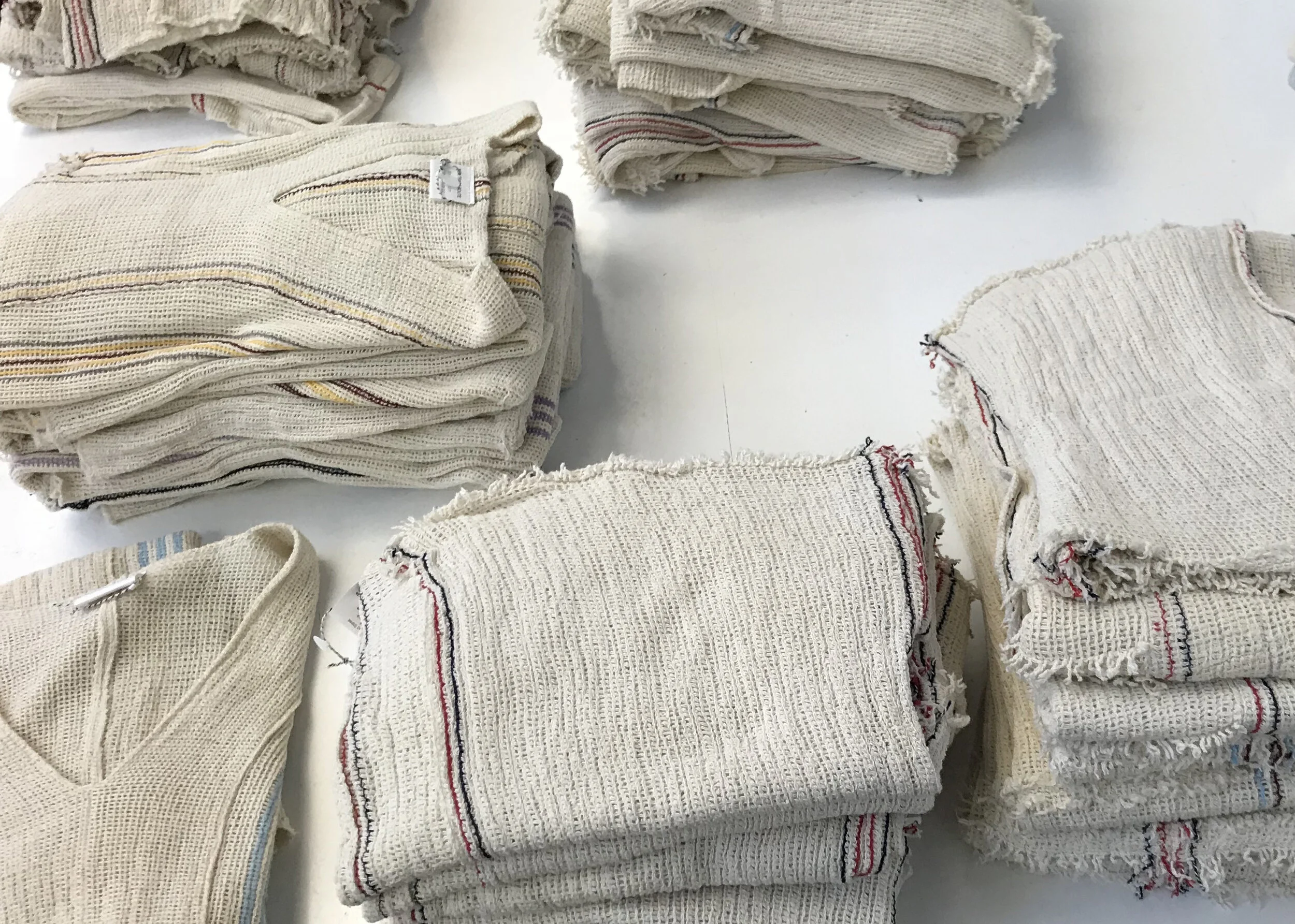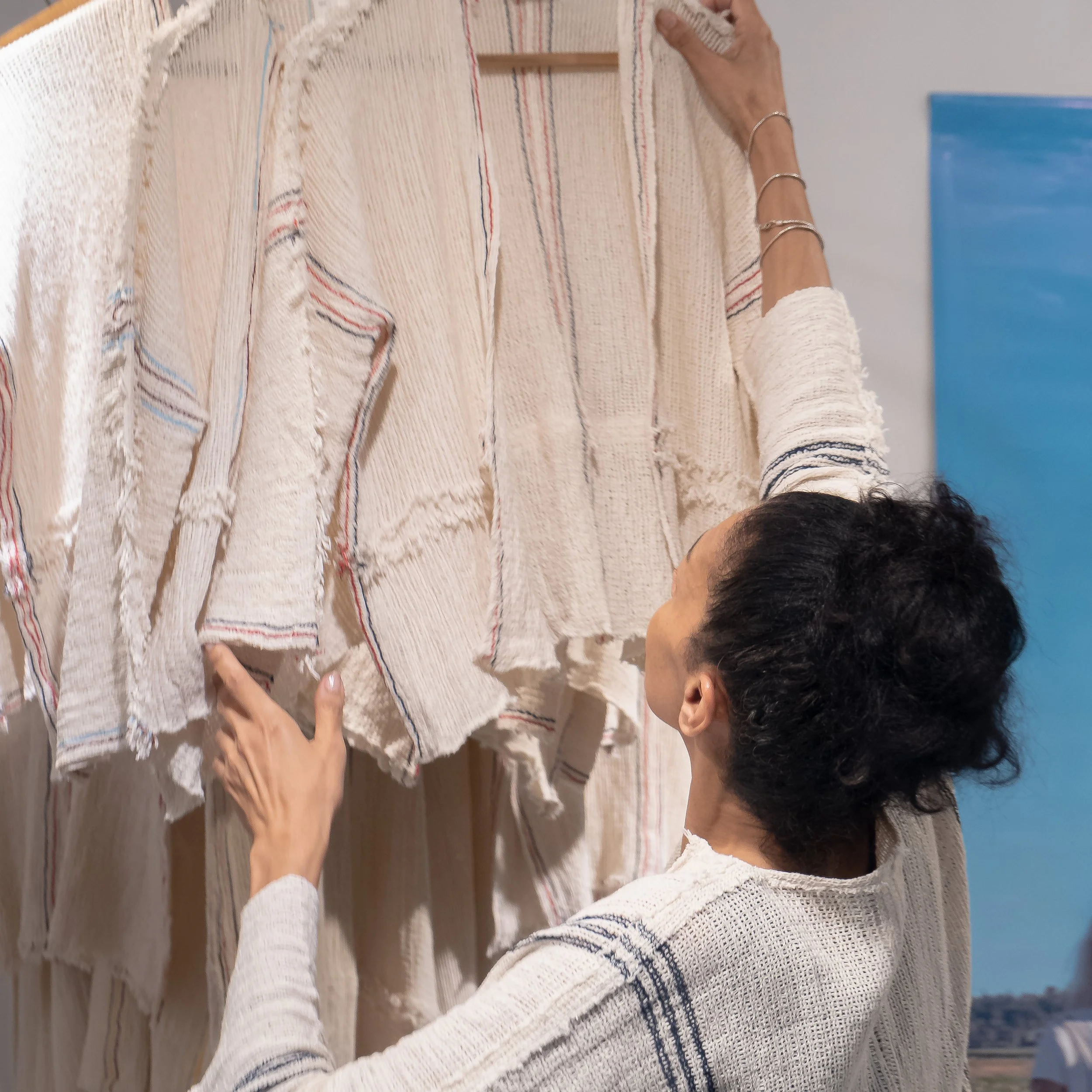 The unprocessed cotton knit cloth drapes beautifully. The fabric is a light, breathable, layer for sun or chill. The way it feels is important. The pieces continue to get softer and form to your body. Each garment is designed to take advantage of the natural properties of the fabric — its texture, simple stripes, soft fringe selvage finishes and sensual drape.